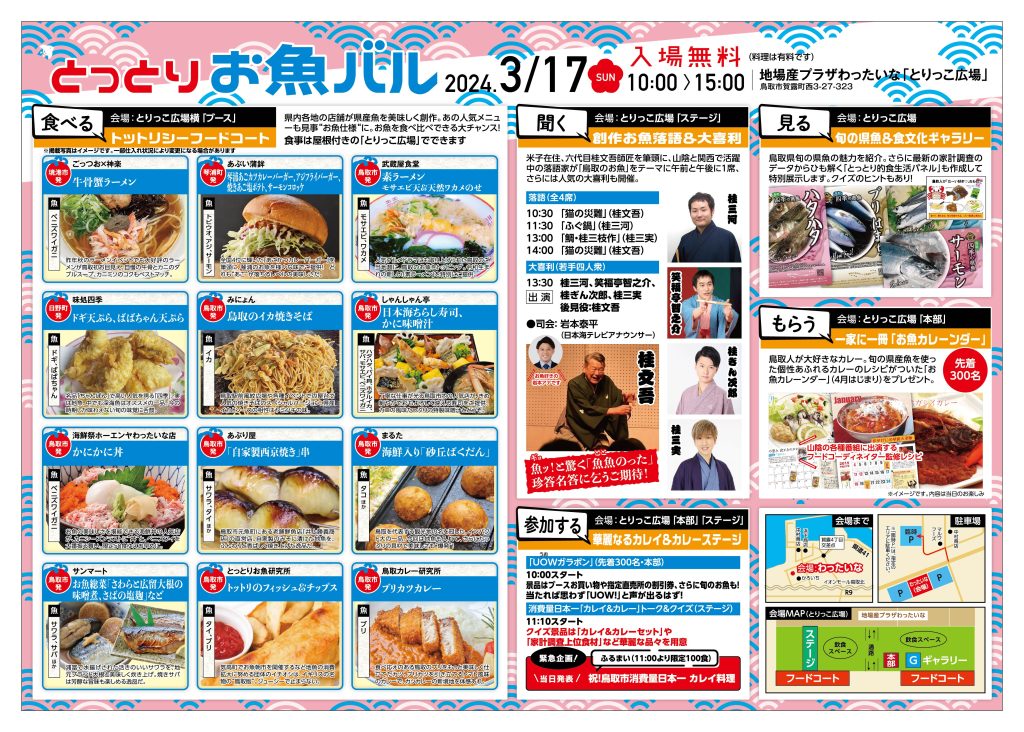 お魚創作料理、創作落語&大喜利、パネル展示、限定ノベルティ、ガラポン&クイズ