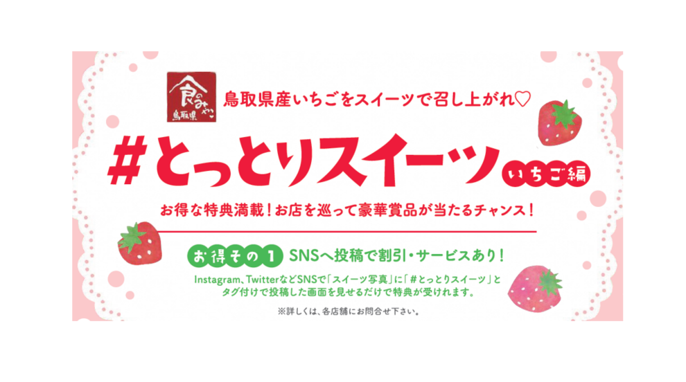 TOP イベント・キャンペーン #イベント・キャンペーン 鳥取県全域 とっとりスイーツ~いちご編~開催!令和5年2月28日まで! 鳥取県全域 SNSで地産地消を広めようキャンペーン~開始~white(ホワイト)編! 令和5年1月31日まで! 鳥取県全域 #とっとりスイーツ~秋編~ 令和4年12月26日まで! 鳥取県全域 SNSで地産地消を広めようキャンペーン開始!令和4年9月23日から11月3日まで 鳥取県全域 もっと地産地消月間開催!令和4年9月23日~11月3日まで 鳥取県全域 とっとり0929(和牛肉)の日キャンペーン!! 令和4年9月29日を中心に様々な特典が! 12 全てのとりたべ記事 Follow us