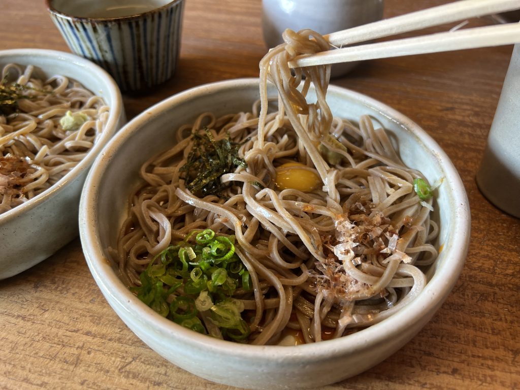 つゆをかけて食べます。倉吉の蕎麦は美味しい!