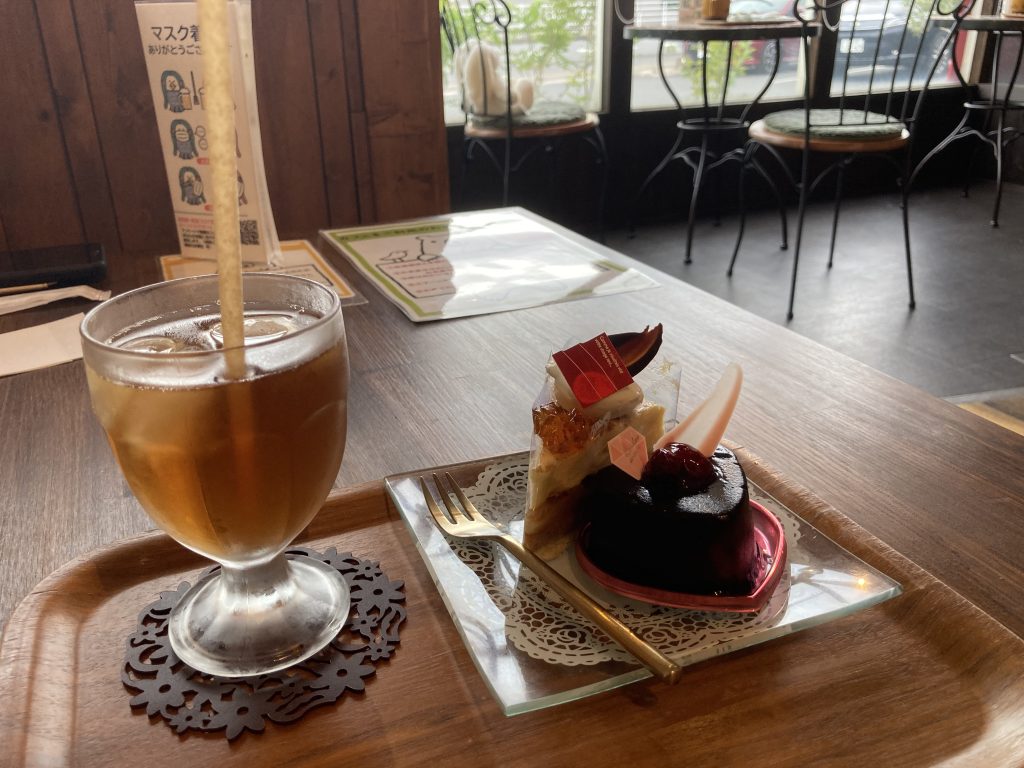 Nさん注文、ケーキセット。ショーケースの中からお好きなケーキを2つ選んで食べられます。