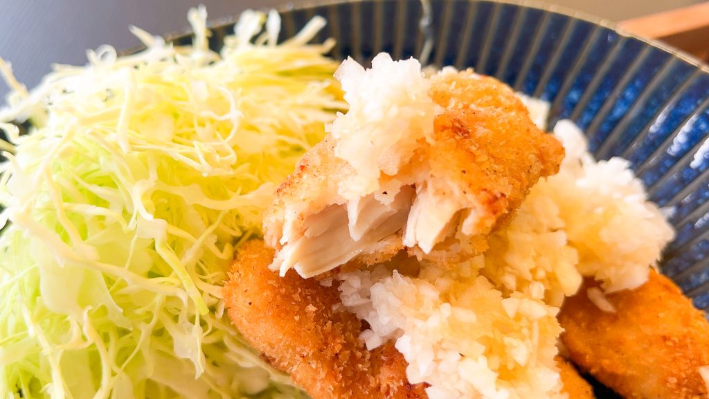あっさりとしていて食べやすいササミが、お手製の大粒大根おろしポン酢と組み合わされる事で、ポリポリとした食感を残しつつさっぱりとした爽やかさ、そして付属するポン酢でさらに味変もできる、最高のササミカツでした~