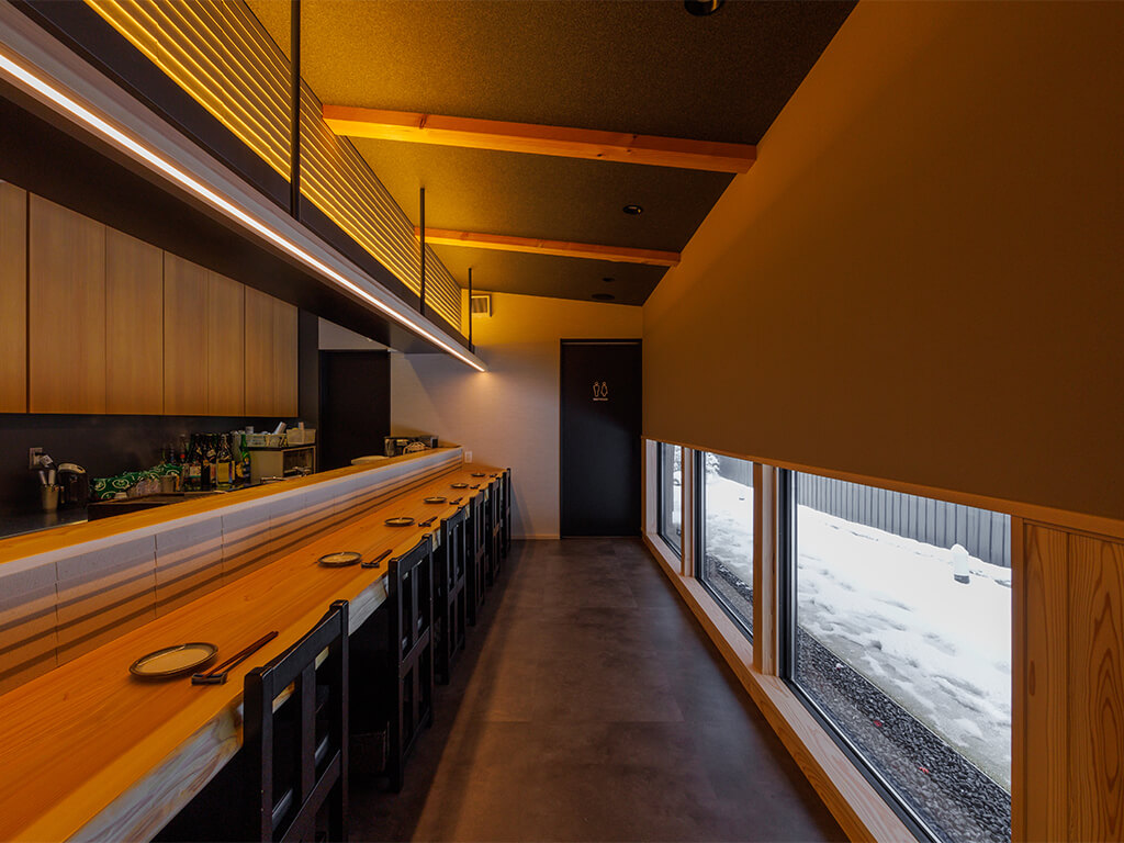 飲食店が立ち並ぶ一角(大将は「裏末広」と呼んでいます)にグレーの上品でオシャレな建物があります。 こちらの手前にあるお店が「純米酒とやきとり、もつ鍋のお店 御銀」さん。 入り口前に設置された看板も目印になっており、道路から店内の様子が見えないのが、まさに「大人の隠れ家風」と感じてしまいます。 暖簾をくぐり店内に入ると、洗練された落ち着きある空間です。 店内はカウンター席とテーブル席があり、ランチはカウンター席でいただきます。 (カウンターの画像は店舗提供)