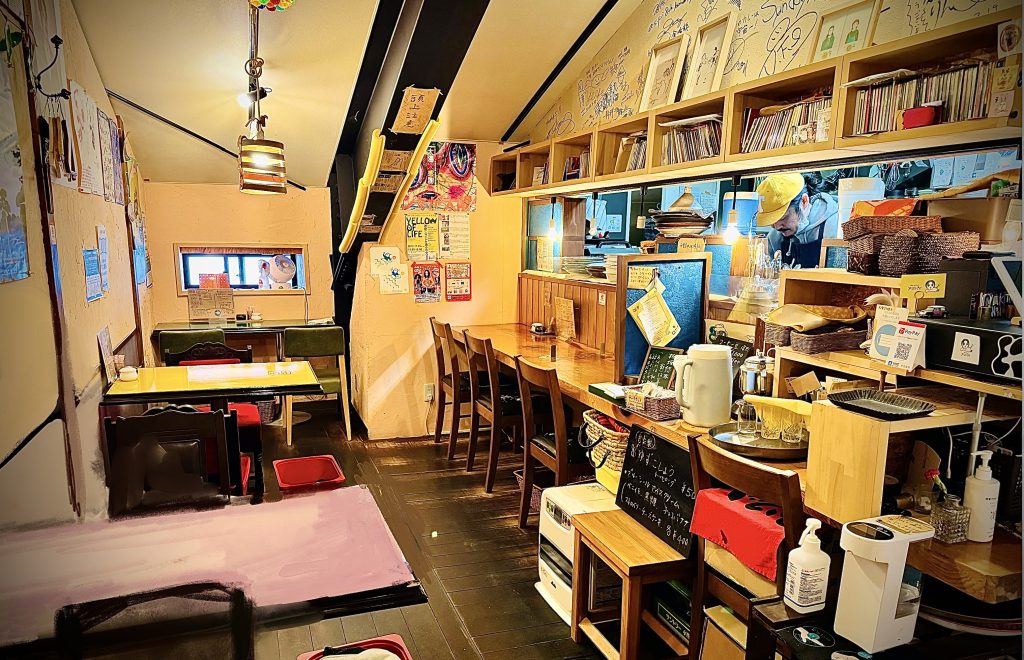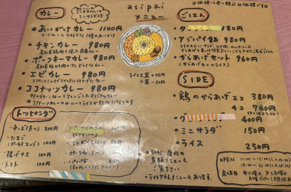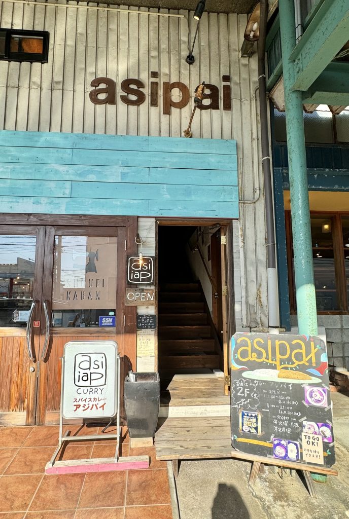 おしゃれな店舗が軒をつらねる長屋風の佇まいの一角に、アジパイさんはあります。 2階に上がり、中に入ればスパイスの香りがいっぱい✨ 秘密基地のような店内には音楽や演劇、アートなどいろんなジャンルのポスターやチラシが貼られています(漫画も置いてありました😊)。奥まったところにあり隠れ家のような雰囲気なので、最初はちょっと入りずらいかもしれませんが、一度行ってしまえば行きつけにしたくなる空間です❗️