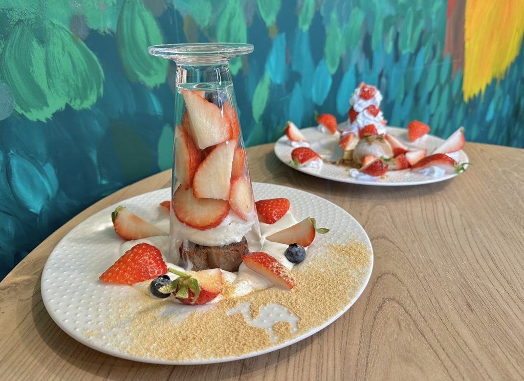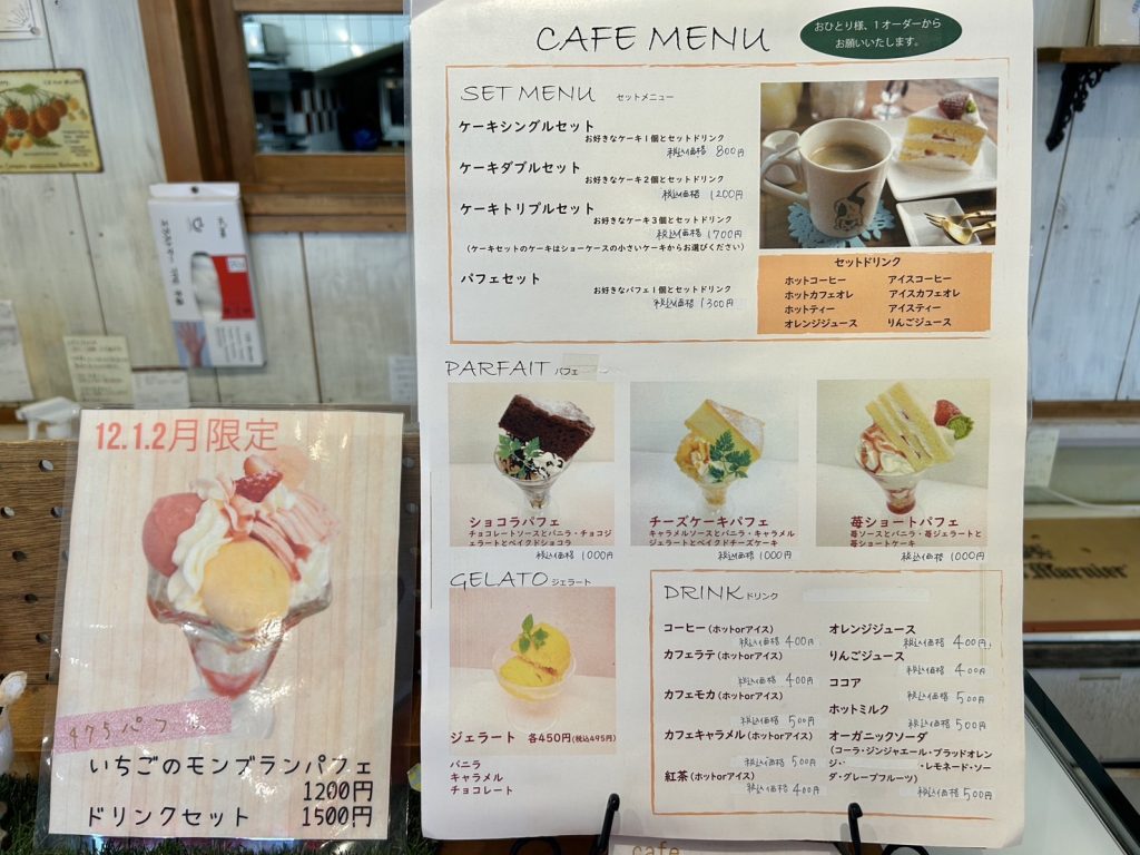 他にもチーズケーキやベイクドショコラが乗ったパフェもあり、気になるメニュー盛りだくさんだわん!定番メニュー「苺ショートケーキパフェ」は、次回絶対に注文するわん。