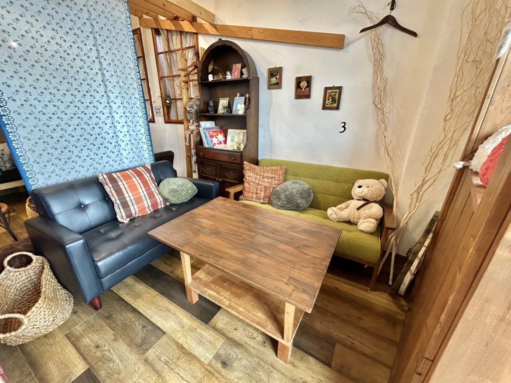 国道300号線沿い、ふーるぽっしゅの外観は白い外壁に赤い看板が目印だわん。店内は、暖かくくつろげる空間だわん。クッション付きテーブルがあるグループ席が二か所、一人から二人で楽しめる個人席も3箇所あるわん!クッション席は、小さなおこさま連れでも居心地良く一緒にすごせるわん。