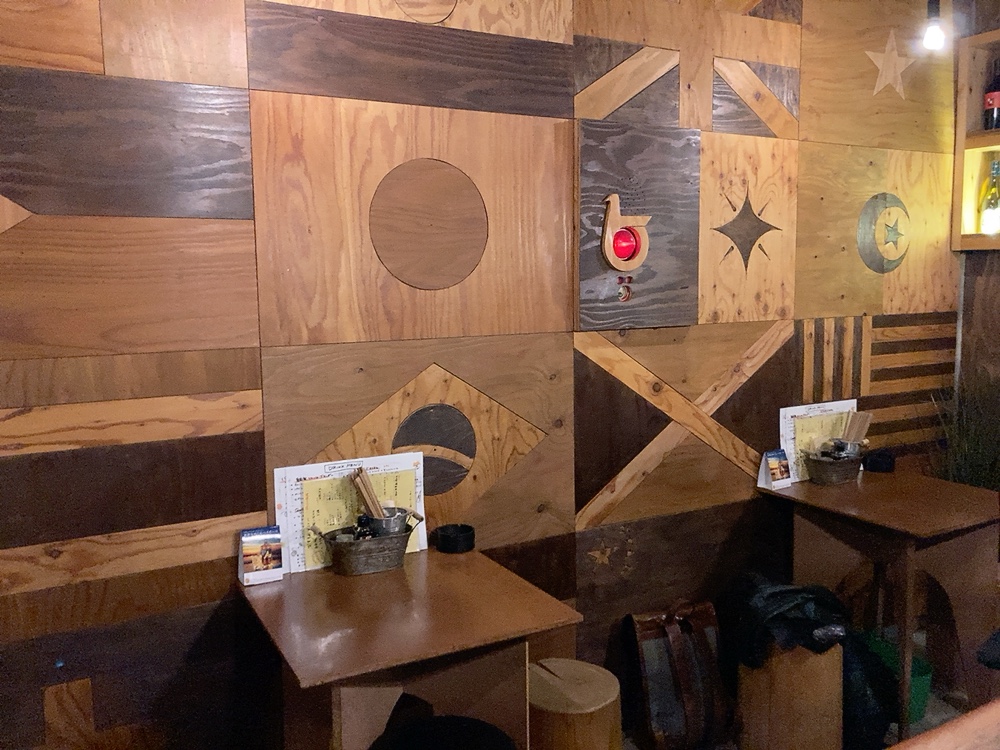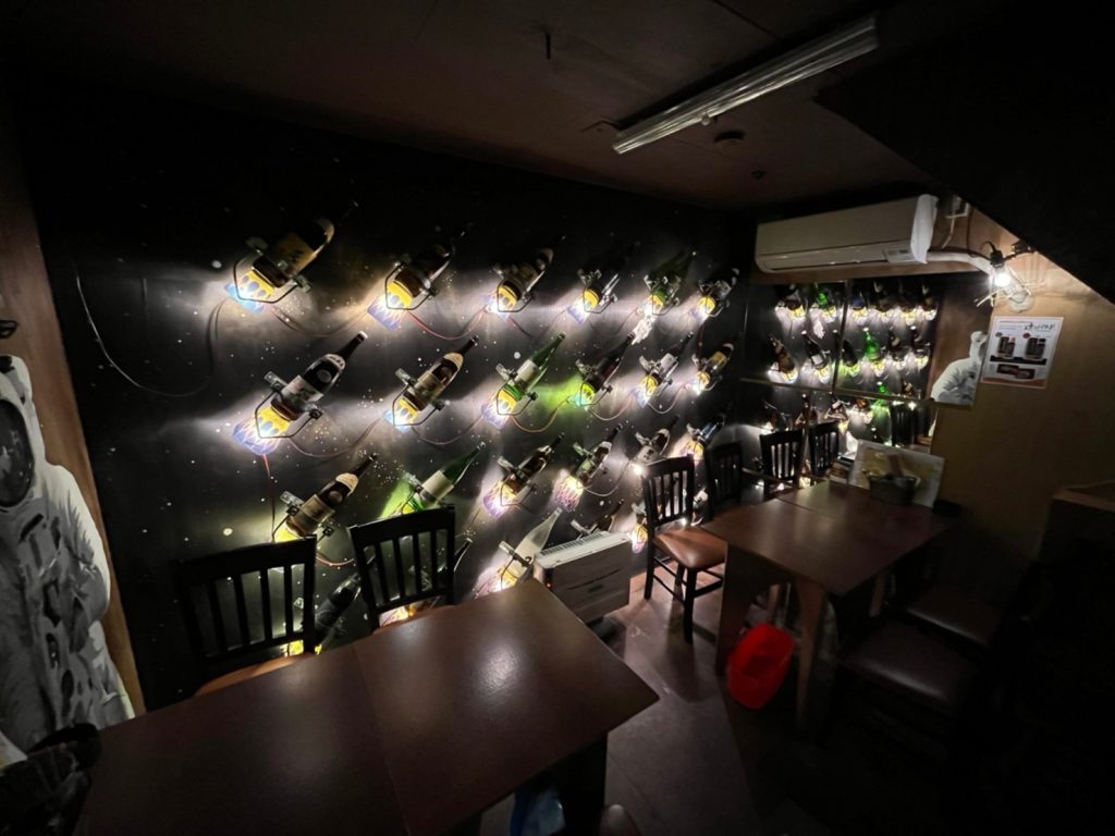 店内は、柱に使用される軽量鉄骨を使用したオブジェがあったり、 『飛ぶ鳥』の姿を鳥取県のかしらもじの『と』に造形した鳥取県の県章があったり、 たくさんのお酒や、宇宙空間をイメージした空間があったり!!!