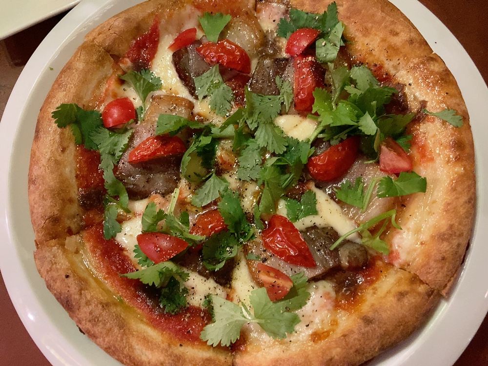 パクチーとアンチョビのピザに分厚い大山ルビー豚を追加でトッピングしていただきました。