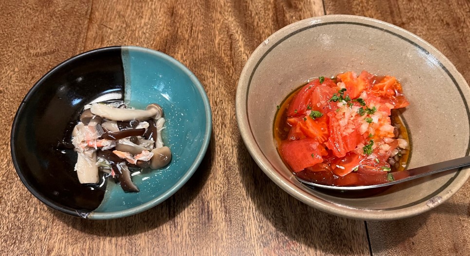 最初にきのこと松葉ガニの小付けと、トマトサラダが出てきたわん。