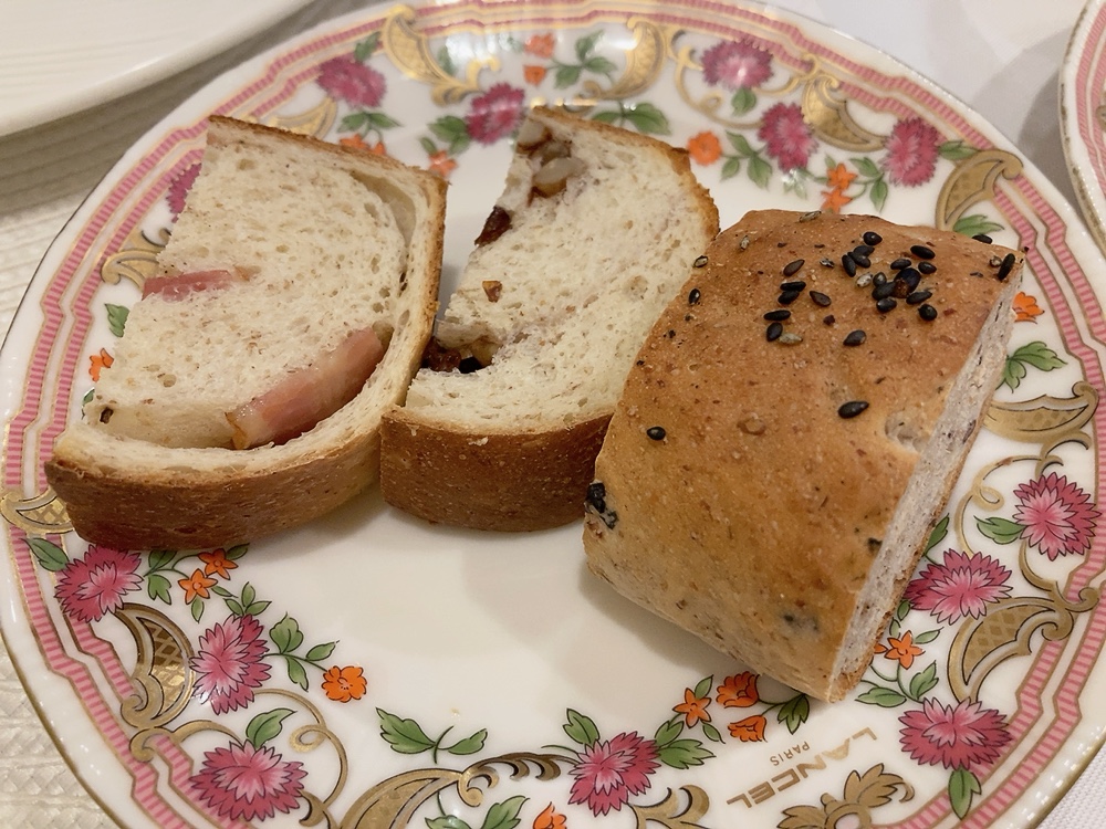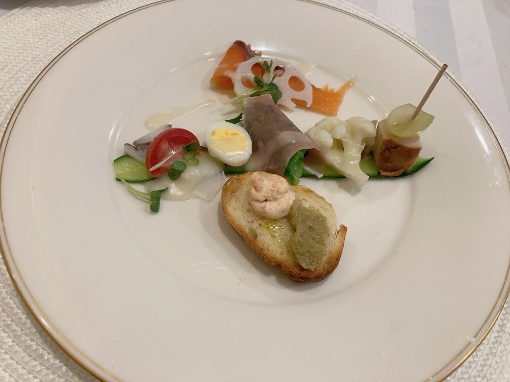 写真のオードブルは、『ナスのピューレとスモークサーモンのピンチョス』『タコのカルパッチョ』『菜の花と生ハムのサラダ』『自家製カリフラワーのピクルス』『大山鶏の燻製』『スモークサーモン』スープは『カリフラワーのポタージュ』、魚料理は『イトヨリとタラのムニエル』自家製パンは『くるみレーズンパン』『ベーコンパン』『十六穀パン』自家製スイーツは『スフレチーズケーキ』『ガトーショコラ』『林檎のシャーベット』『洋梨の赤ワイン煮』『オレンジとキウイ』です🤤💫フランスde BUYERの鉄フライパンを使用して調理された鳥取県産のお魚は、皮パリパリ、身はふっくら柔らか。自家製スイーツは甘くてずっしりしたケーキにさっぱりフルーツのシャーベットやワイン煮の組み合わせ。バランス良く最後まで飽きることなくいただけました。複数のデザートがいただけるのも魅力的ではないでしょうか?🥺👏スペシャルランチ 2200円