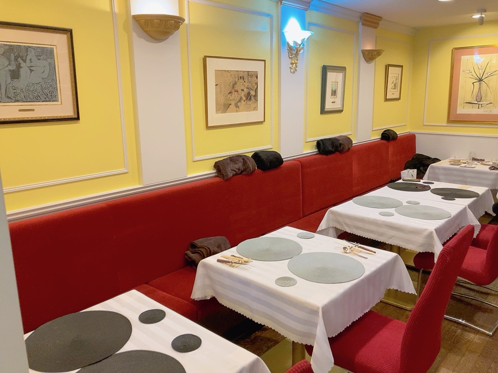 お席は4人がけのテーブル席が1つ、2人がけのテーブル席が3つ、半個室の2人がけのテーブル席が1つです。絵画がお好きな店長さん自慢のピカソ、ビュフェの絵が多数飾られた店内は昨年改装されたばかり🥺🫶黄色、白、赤を基調とした明るくて温かみのある店内はフランスのプロヴァンス地方をイメージされたそうです🇫🇷✨ランチフルコース 2700円