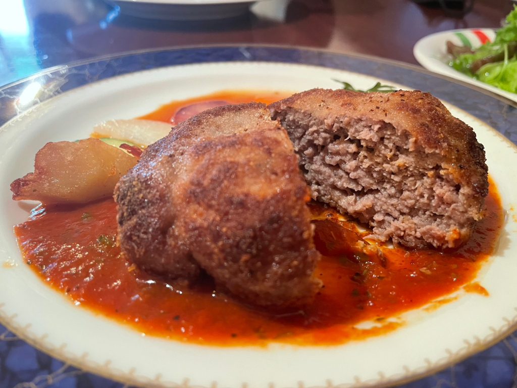 ハンバーグの周りにはパン粉がまぶされており、切ってみると表面がカリッとした感触。