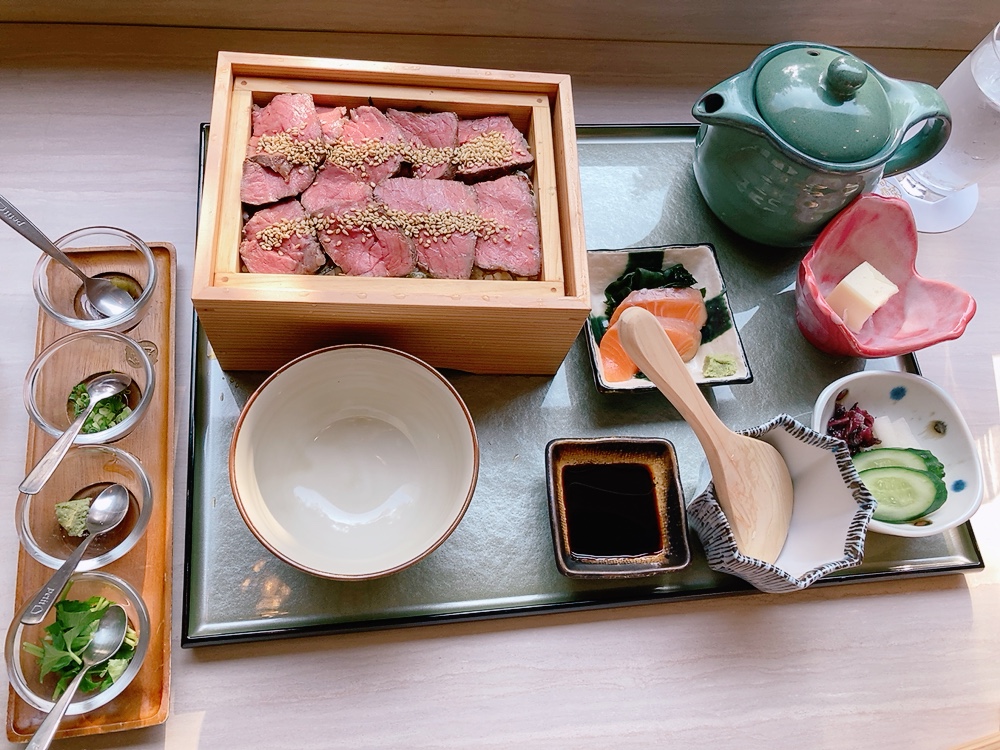 『鳥取和牛のひつまぶし』『お刺身』『季節の豆腐』『薬味4種』『漬物3種盛り』『旬のフルーツ』がいただける今月のおススメランチ。