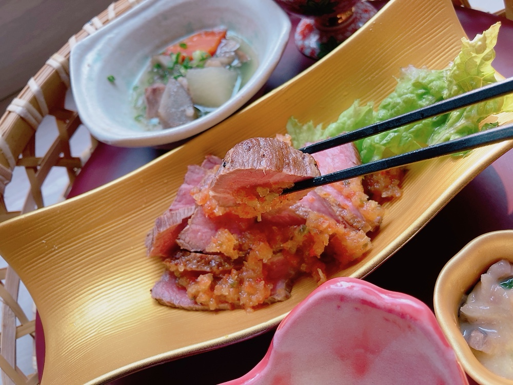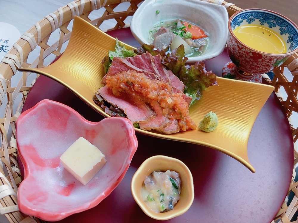 『ご飯』『お吸い物』『漬物』『さつま芋豆腐』『にしんの生姜味噌』『鳥取牛のローストビーフ野菜ソース添え』『南瓜のすり流し』『 鳥取牛の塩煮込み 』『旬のフルーツ(おうかがいした日は林檎、バナナ、シャインマスカット)』をいただきました。