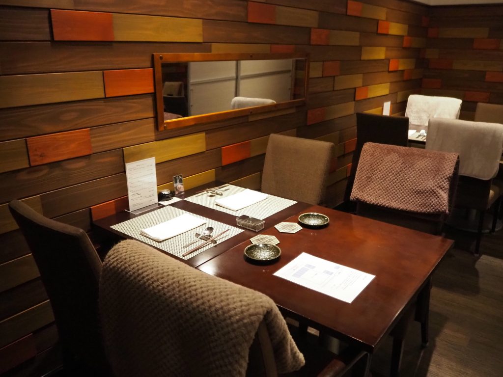 カウンター席とテーブル席があり、今回はカウンターで。茶色を基調にした落ち着いた雰囲気です。 席に着く前に店員さんがコートを預かってくださいました。また「空調は大丈夫ですか?」とのお声かけも。 さりげない心遣いが嬉しいですね。