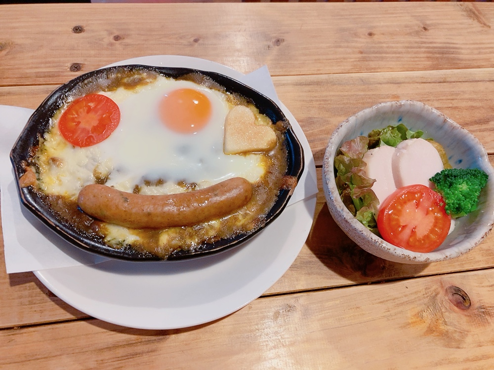 大山豚のソーセージや卵で顔を描いた、見た目からインパクトのあるカレー😂💫辛さの中にもマイルドさがありました。卵やチーズがトッピングされており、卵を崩したり、チーズと絡めていただくなどなど!!味変しながら最後まで美味しく、楽しみながらいただけました。