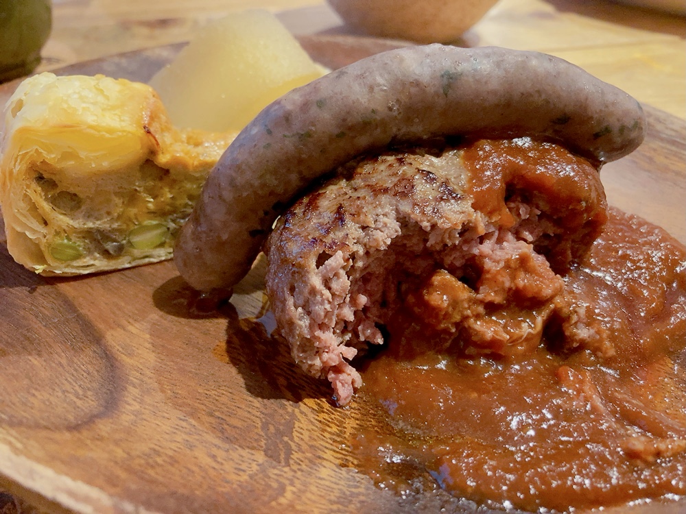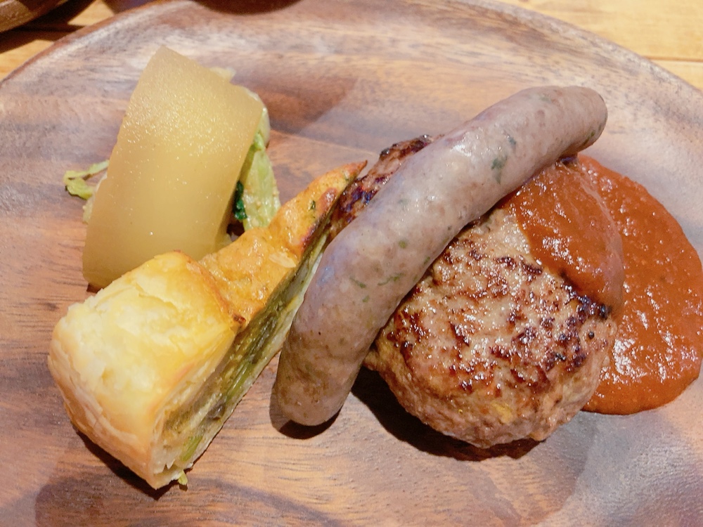 日野郡江府町の猪と鹿肉を使用したハンバーグ。(仕入れ状況によって万葉牛と大山豚を使用したハンバーグが提供される日もあります)