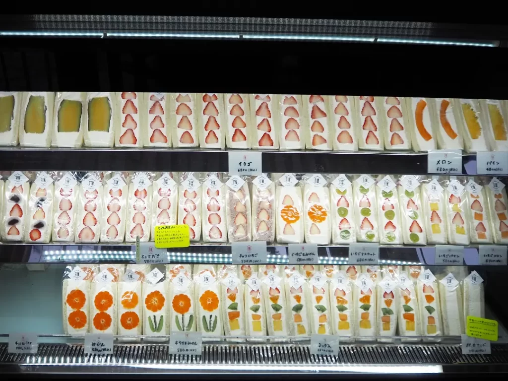 皆生温泉の観光センターから徒歩1分ほどのところにあります。 ネイビーブルーが鮮やかな角にあるお店です。 テイクアウト専門なのでお店は小さいですが、入るとすぐにきらびやかなショーケースが! フルーツサンドがぎっしりと並んでいて宝石箱のようです。 フルーツは可能な限り鳥取県産のものを使用し、オーナー自ら買いに行くこともあるとのこと。 どのフルーツも他では見たことないぐらい大きくて鮮やかです。