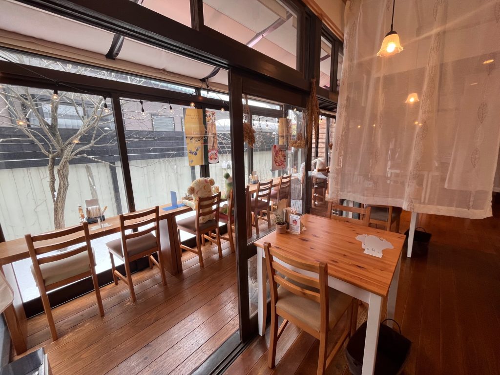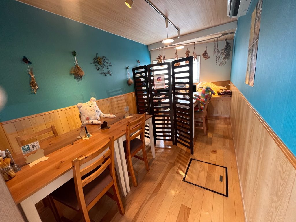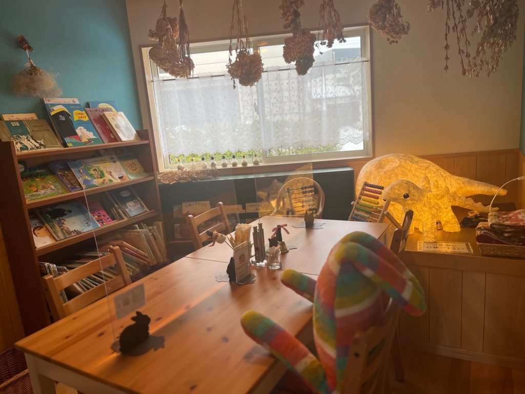 スーパーマーケット「マルイ薬師町店」の駐車場内にあるお店。 木のぬくもりあふれるあたたかい雰囲気の店内は、 テラス席やテーブル席、お子さんと一緒でもゆったりできる個室があります。 テラス席は、緑あふれる明るい庭を見渡しながら・・・ 奥の個室は、絵本もたくさんあり、子どもイスもありました。 ソーシャルディスタンス用にかわいい先客(ぬいぐるみ)が居たりと、 かわいらしい雰囲気です♡ 広い駐車場もあり、 ゆったりとした時間が過ごせます。