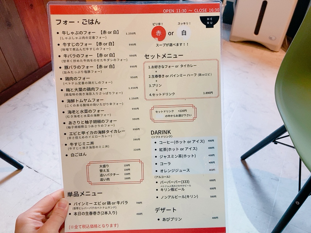 *9種類のフォーから一品orタイカレー*生春巻きorバインミーハーフ(鶏かエビ) *プリン、5種類のドリンクから一品選びます。スープはピリ辛赤とすっきり白の2種類がありますが今回はピリ辛な赤スープを注文。 出来立てアツアツで提供されるフォー。さらにスープにスパイスが入っている、スパイシーな赤スープでいただくフォー。しっかり温まり、食べ終わるころにはじんわり汗が。。。見た目より辛さは控えめで食べやすく、辛いのが苦手な方でも楽しめると思います👍◎ また、牛骨スープにトッピングの牛バラの甘味がスープに溶けて絶品。レモンを絞って味変しながら!!最後まで飽きることなくいただけます。 日本米に自然薯をプラスしたグルテンフリーの生麺。小麦アレルギーのある方でも安心です✌️麺は平たく、つるつるっとしたのど越し、もちもちの食感。ぶちぶち切れたり、伸びることのない食べやすい麺です。また、フォーの麺は水分を吸収しやすく、油を吸収しにくい性質があるため脂質過剰によるカロリーオーバーを防げる嬉しいおまけ付き🫶🫶さっぱり、ピリ辛な生春巻きも人気メニュー。なめらかプリンはきび砂糖使用。あっさり、シンプルな食べやすいお味。食後にぴったりです。鶏肉のフォー 950円