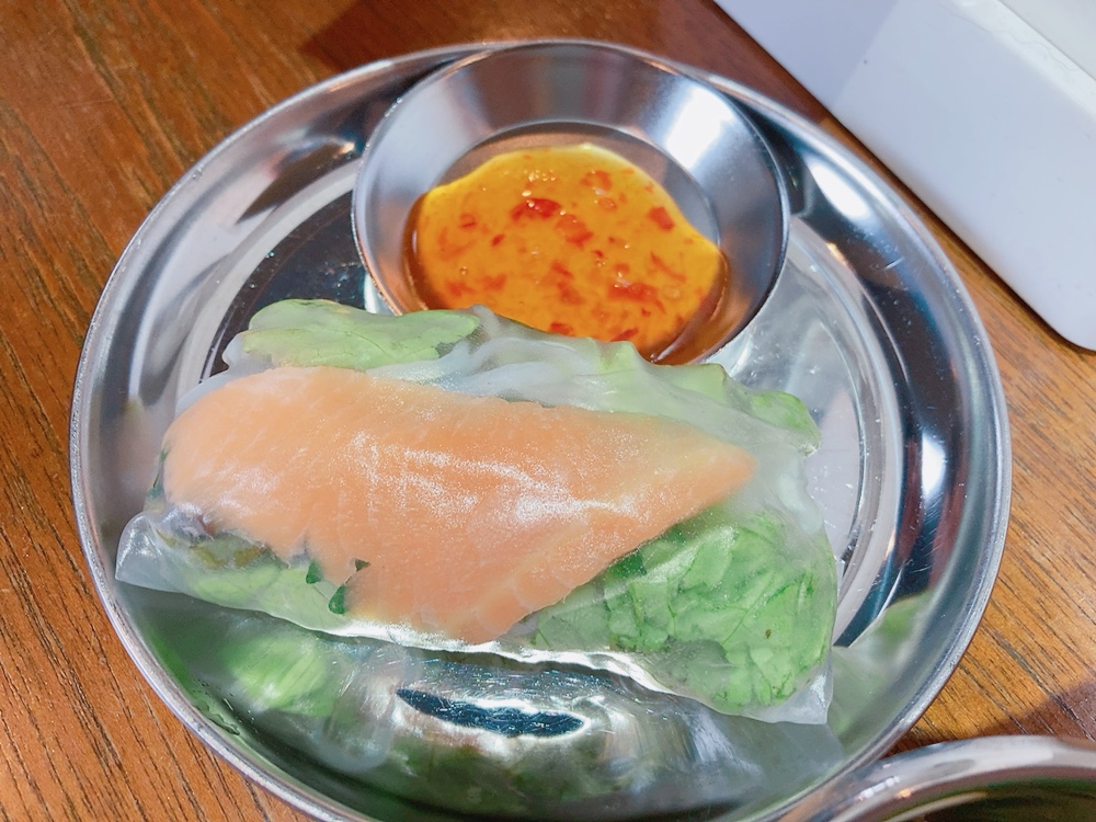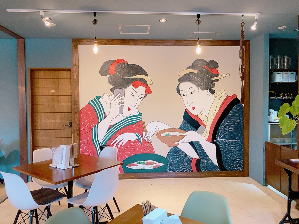 お洒落でスタイリッシュ、清潔感のある店内。まるでカフェのような雰囲気。和服の女性がフォーの前で、携帯電話片手に会話中📲そんなインパクトのある絵が最大のポイント!!一度見たら忘れられないですね😲⚡️セットメニュー 1890円 (牛バラのフォー、生春巻き、プリン、セットドリンク)