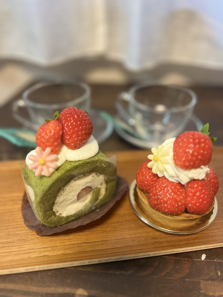 ロールケーキはフォークを入れたらとたんにわかるふわふわ感。お口にいれるとふわふわの中にもっとした食感と、広がる抹茶の風味といちごの相性も良し♪