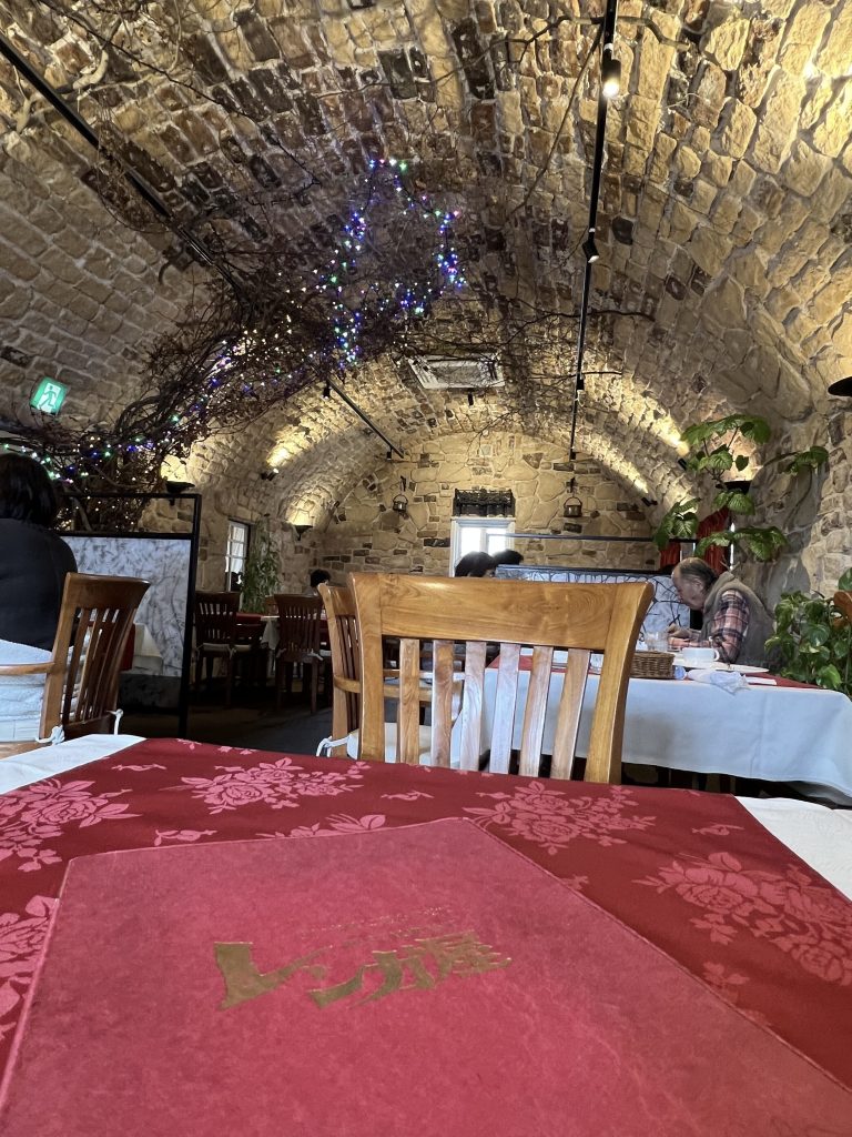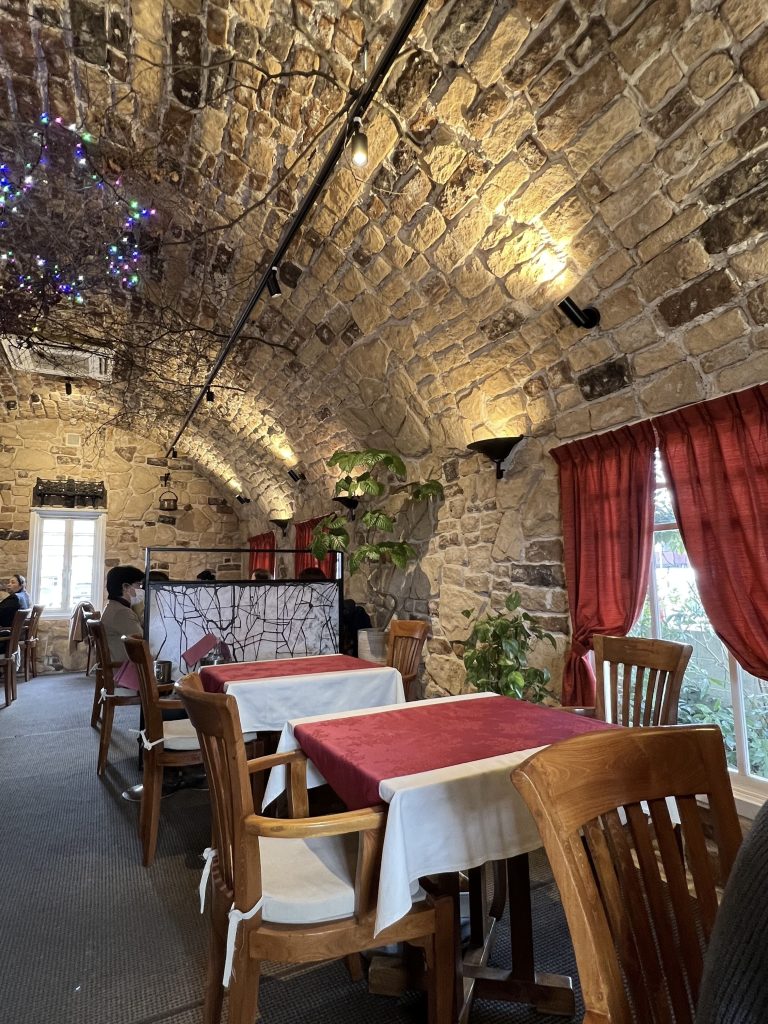 店内に入ると、想像していたより広い! 天井はレンガ造りになっていて落ち着いた空間ながら、石やレンガ、漆喰を使った壁や床、アーチ形のダイニングがあり思わず見渡してしまいます。広い店内はランチタイムにはお客さまで埋まり、空き席がありラッキーでした。