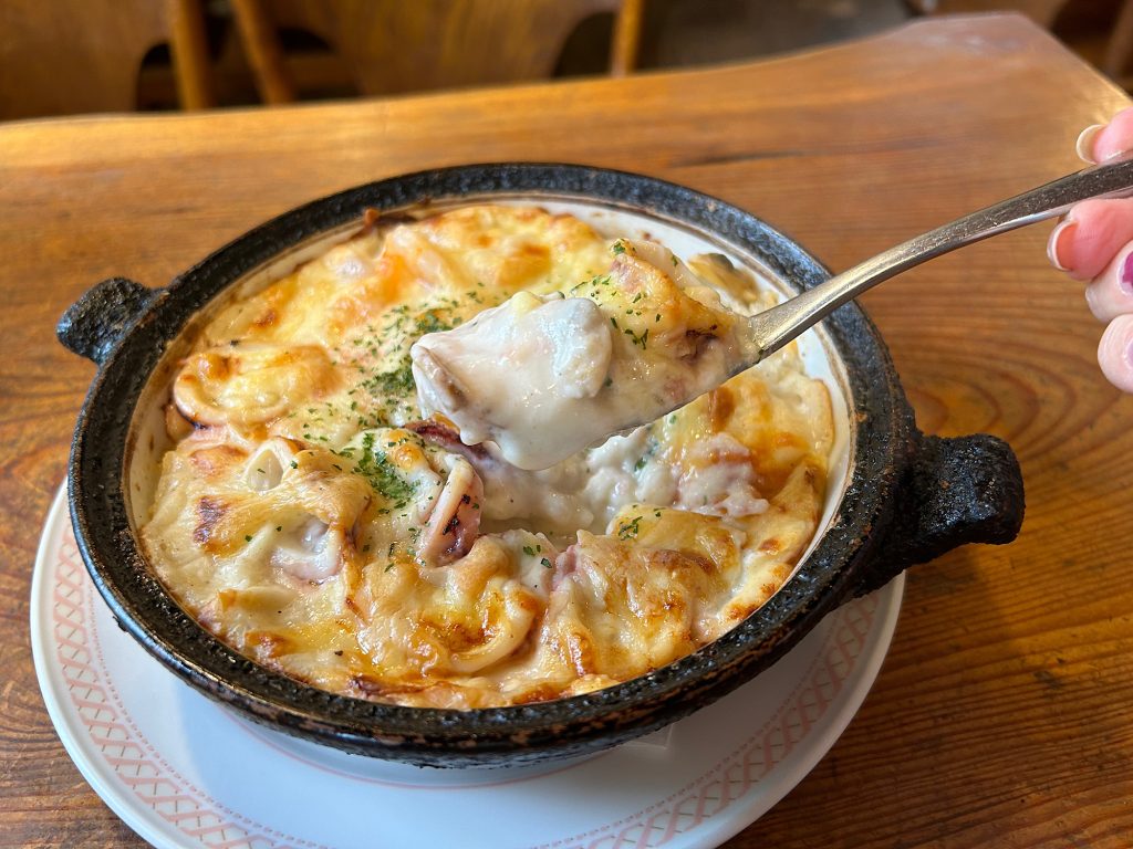 魚介類はイカやエビ、アサリなどゴロゴロ入って程よい焼き加減のチーズとお米の絡みが絶妙!!