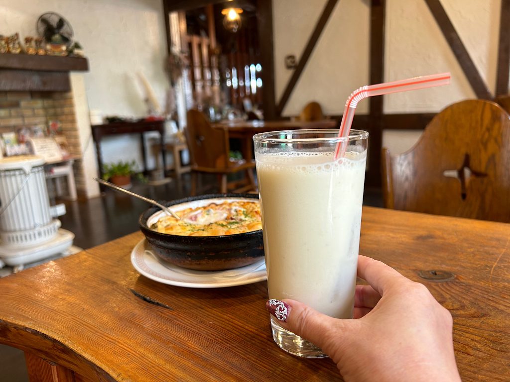 鳥取県の岸田牧場さんの牛乳を使ったバナナジュースは牛乳とバナナの美味しさがギュッと詰まっていてリゾットとの相性も良すぎでした♡