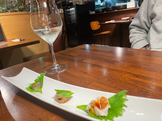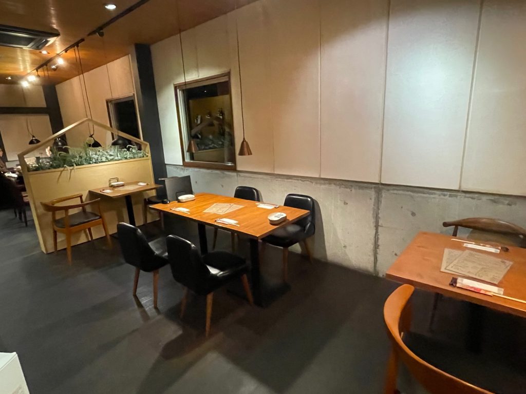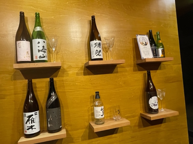 初めて入った時は(えっ?ここお寿司屋さん?)と思うほど オシャレでスタイリッシュな空間。 テーブル席の間隔がきちんとあるので、ゆっくり会話もできます。 壁には、地元のお酒が並んでいましたよ。