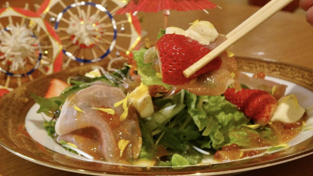 【しゃんしゃんサラダ】は小さい傘が付いていて