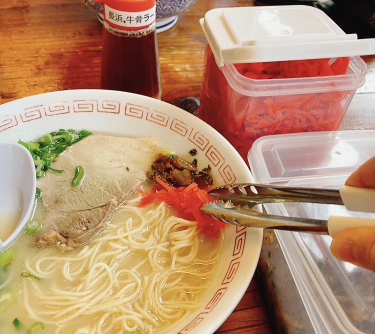 まずはそのままの、本場長浜ラーメンを味わって、味変で高菜明太子や紅ショウガを加えると