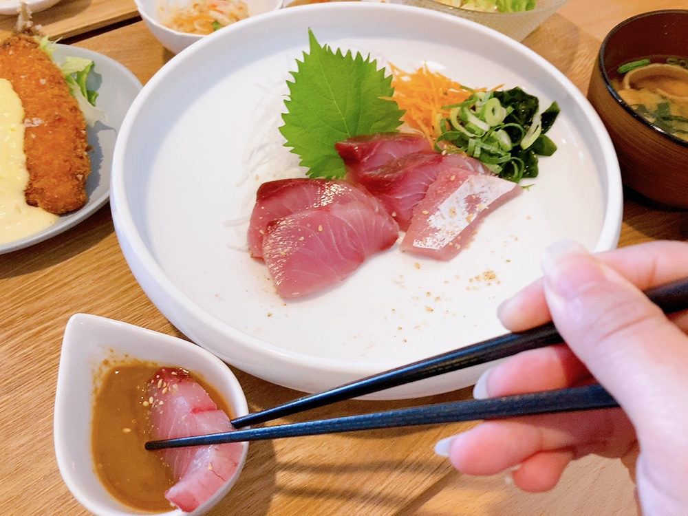 境港産のマルゴのお刺身はとにかく厚切り!!『しっかりとした歯ごたえ』で食べ応え抜群◎新鮮で、臭みは全く感じず『甘味』を感じました😳💕タレや薬味で味変しながらいただくのももちろんですが、何もつけなくても魚の旨味が十分に感じられ、ご飯がどんどん進みます。ご飯は大盛と小盛りから選べます。なんと、平日は大盛ご飯を注文すると、ご飯とお味噌汁のおかわりが何度でも無料だそうです!サラダや副菜も品数豊富なのでとにかく『満足感の高い』定食、お腹いっぱいになりました🤣✌️まとめ こんな人におすすめなお店でした。