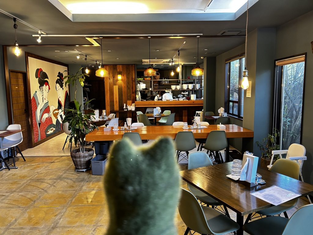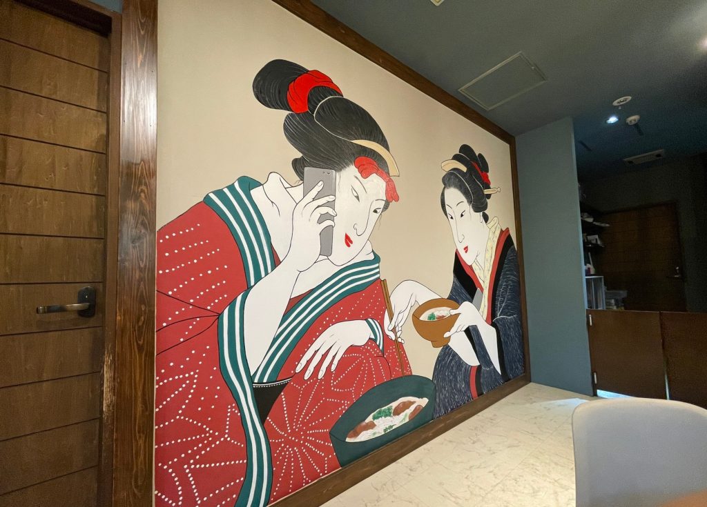 日吉津イオンや海浜運動公園の近くで、もうすぐ海…!という絶好のロケーション✨ 駐車場は店舗前と店舗横にたくさんあるわん! 店内はまるで洗練されたカフェのように広く、女性ウケ抜群だわん🎵 ベトナムというより「和」の雰囲気も漂う素敵な空間…! お店の入り口にもあった、和服女性の絵がインパクト大だわん🌟 スマホ片手にフォーを嗜んでるわん…!👀