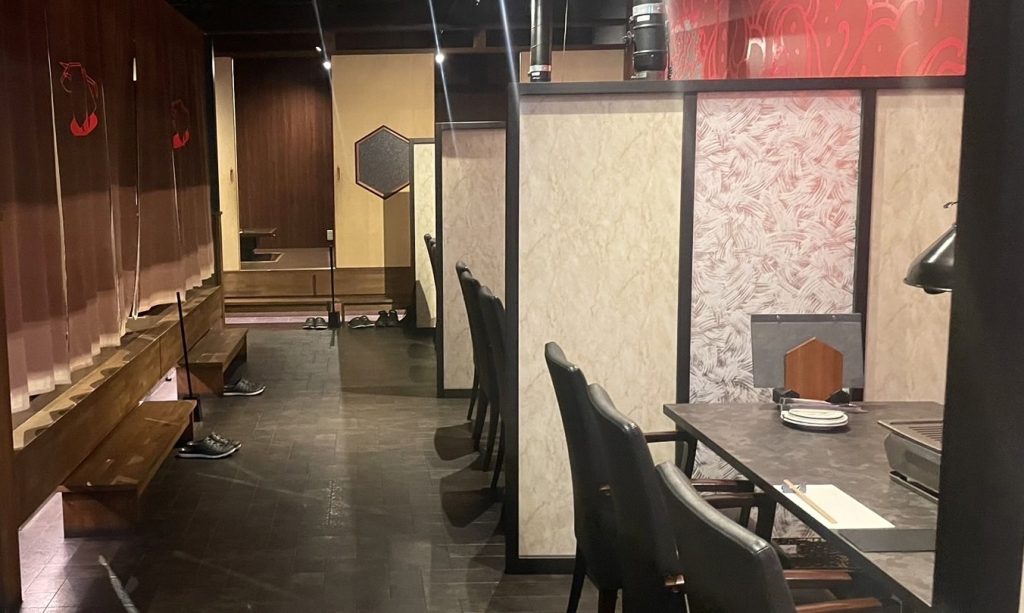 建物全体は黒で、スタイリッシュな外観。 牛のイラストが描かれたこちらの看板が目印です🙌 店内に入ってみると、、赤と黒が印象的な内装🕯️✨ 都会的でとてもおしゃれな空間です。 今回は入り口から入ってすぐ横のテーブル席に案内していただきました。 テーブル席は広めで、6人かけテーブルに6人で座ってもだいぶゆとりがありそうです😌🌿 また奥には座敷のお席もありました! シチュエーションによってテーブル席と座敷のお席が選べるのっていいですよね😊 全ての席にしきりがあるので、周りを気にせずゆっくり過ごせるのも嬉しいポイントです🫶
