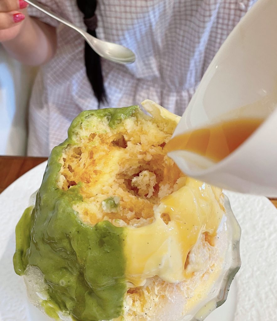 その氷に、抹茶ソースとプリンソースが上からたっぷりかかっていました!