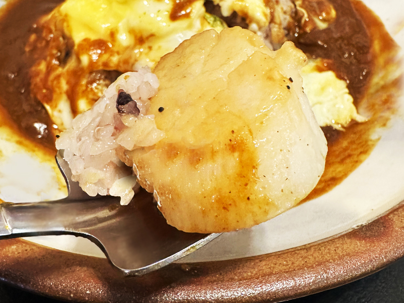 大粒ほたてを噛み締めながら、まろやかなカレーと卵のマリアージュがお口の中に広がります…✨