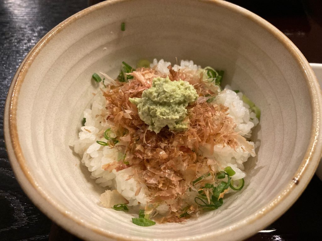 あつあつの関金産コシヒカリに、かつお節とねぎ、『関金わさび』に醤油をかけます。(醤油に溶かしてからでも、そのままのせるかはお好みで。)