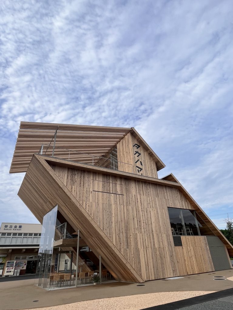 鳥取砂丘に、一際目を惹く木造建築が出現! 国立競技場などの設計でも有名な建築家「隈研吾さん」が手がけたカフェがオープンしました♪ 鳥取砂丘に、一際目を惹く木造建築! 世界的建築家隈研吾さん設計のカフェがオープンしました♪ 地上9メートル3階建ての建物は、鳥取県産のスギを使用。屋上のオープンテラスは、砂丘の景色を眺めることができます。