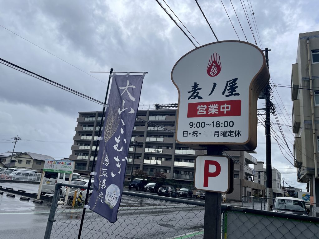 米子自動車学校の目の前!店の前にダンディーなパン職人が出迎えてくれてるわん👀⚡ 大山こむぎと書かれた旗もなびいてるわん🚩 お店の前の駐車場は、4台停められるわん! お店の中に入るとパンがズラリ!見ているだけで楽しくなってくるわん✨ お持ち帰り専用のパン屋さんだわん♪