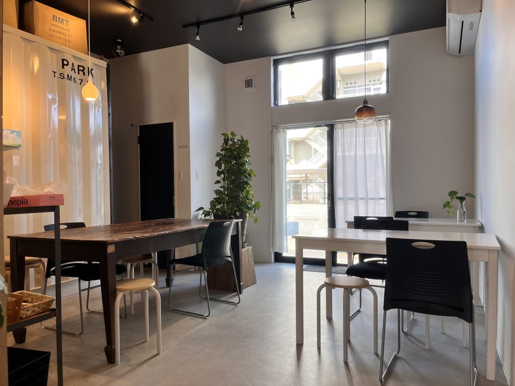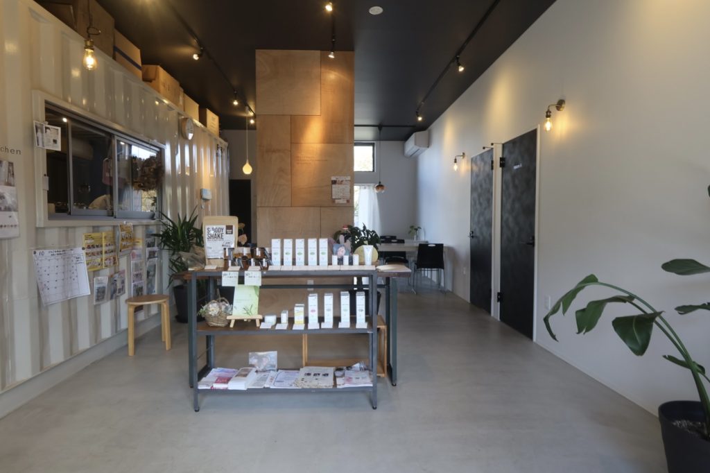 お店は住宅街に佇む、特徴的なダークグレーの建物。 店内には、注文スペースと自然化粧品などが陳列されたエリアが広がり、アットホームな雰囲気を感じます。 テイクアウトをする方が多いようですが、奥には4人掛けのテーブルが3つ用意されており、長時間でなければ店内でも食事を楽しむことができます。