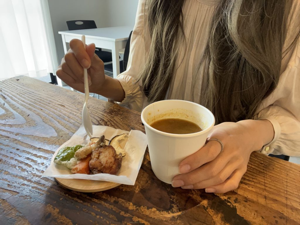 いただいたレギュラーサイズは女性におすすめのサイズ感で、スープだけでも程よいボリュームがあります。カレースープの他にも、さまざまなスープや地元のブランド米を使用した塩むすびなどの常時数種類のメニューが用意されており、お得なセットメニューも楽しめますよ。
