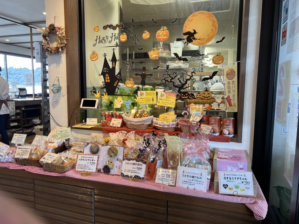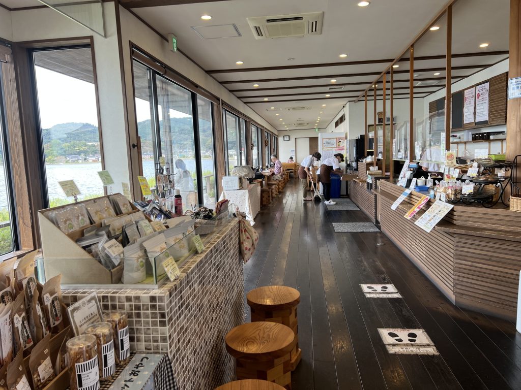 お店に入ると一番先に目に入るパンの棚があり季節に合わせたキャラクターパンから 見るからに食べたくなるようなパンが並んでいて思わず手が出てしまいそうになりました。 その先に足を進めると総ガラス張りで東郷温泉七福神の足湯のひとつ 「大黒天の湯」が店内にあり東郷湖を眺めながらのんびりと足湯が楽しめます。 ガラスの向こうにはテラスもあり天気の良い日にはお外でお食事も出来るのが嬉しい。