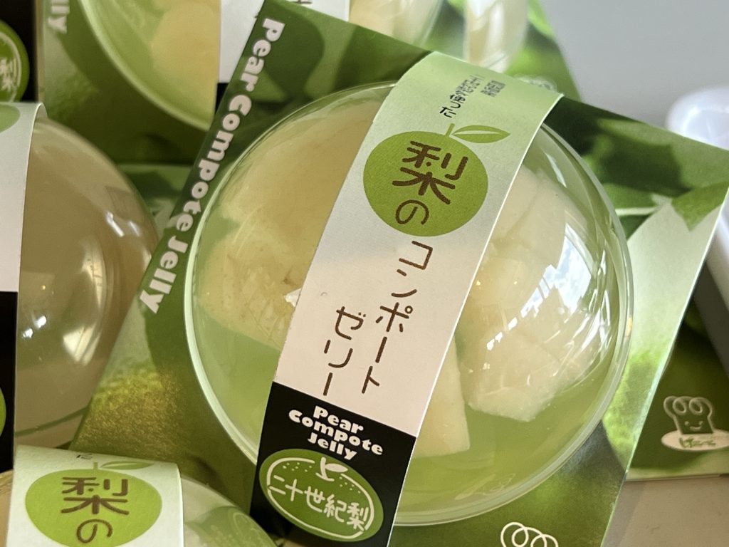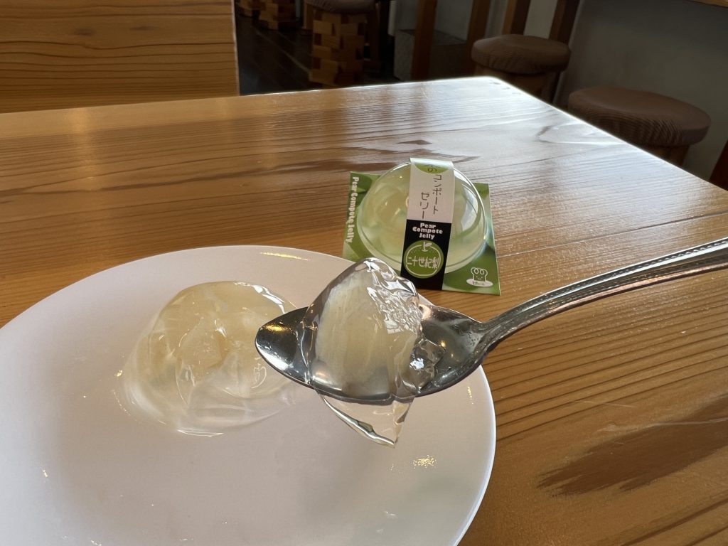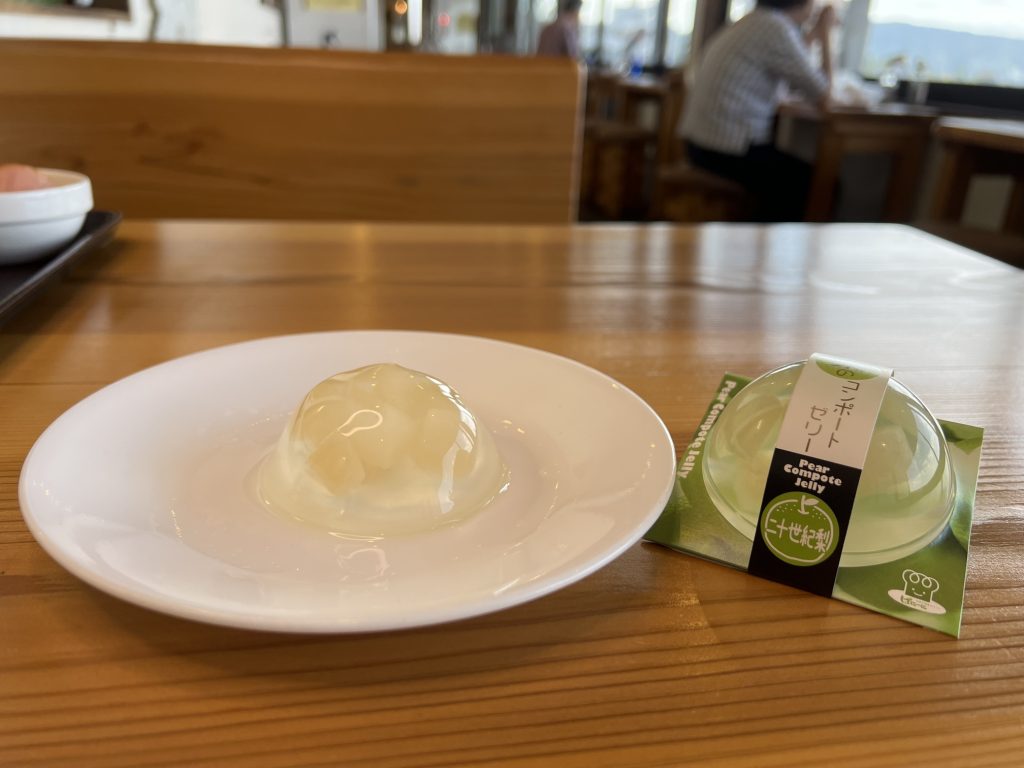 二十世紀梨の栽培の盛んな湯梨浜町東郷らしい梨のコンポートゼリー甘いのかとと思いつつ口の中へさっぱりとしたゼリーの中からシャキシャキした梨の甘さがほんのり、滅多に甘いものを食べない僕にでも新鮮な味のスイーツでした。また、梨の出荷時期には台風シーズンと重なることが多く出荷前の梨の落下とか市場に出せないものを有効活用して生まれた梨のコンポートゼリーだそうです。