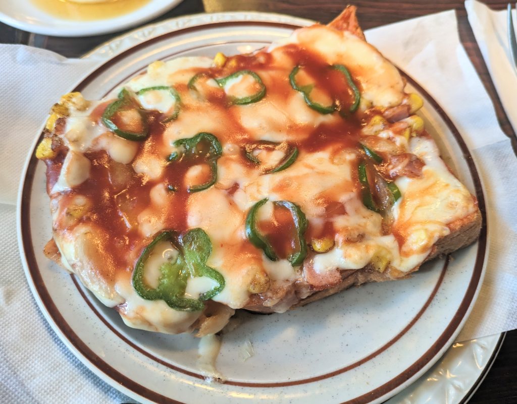 地元の人気パン屋さん「モンパン」さんから仕入れた食パンの表面いっぱいの野菜・チーズ・ベーコンがぎっしり敷き詰められたなんとも食べごたえのある「ピザトースト」トマトソースとチーズが絶妙なバランスで美味しすぎて大満足でした♪