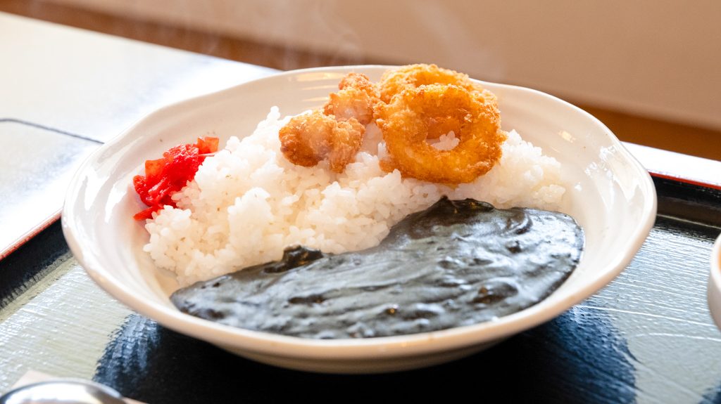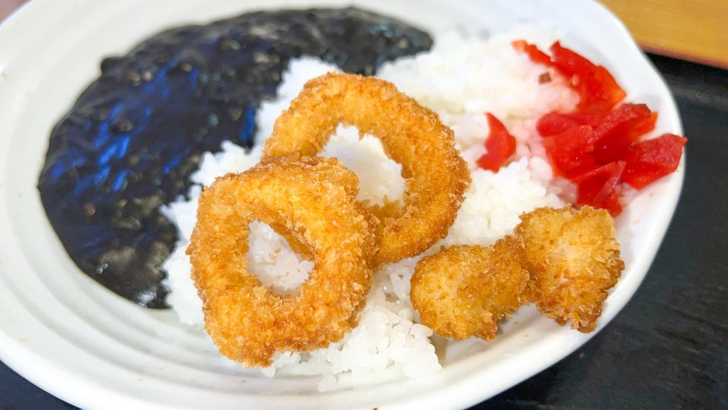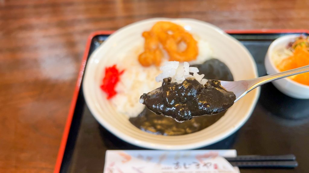 見た目のインパクトにびっくり!?『あじろや』の真っ黒なイカ墨カレーで「見たことのない景色見せてやる!」🦑