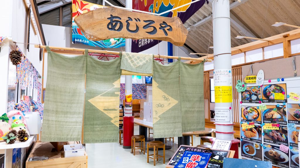 浦富海岸島めぐり船のりばを入ってすぐ左に「あじろや」の入口があり、手前には開放的なテーブル席と座敷席、奥へ進むと個室のテーブル席があり、仕切られた空間でゆっくりと過ごす事が出来ます。 天井の方には様々な大漁旗が飾られており、大漁旗布を使ったオリジナルグッズも購入する事ができるんですよっ♪