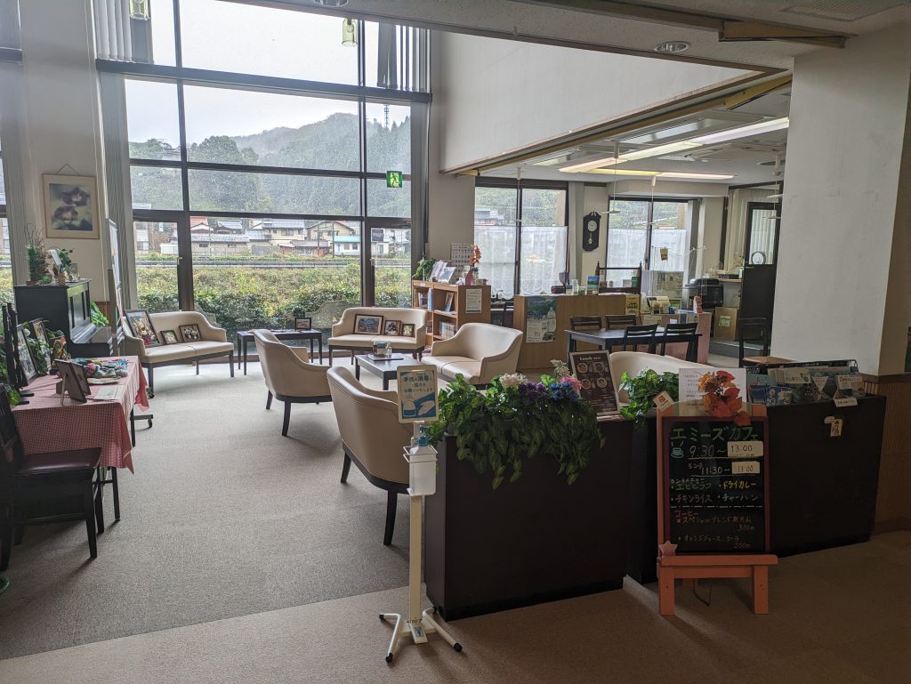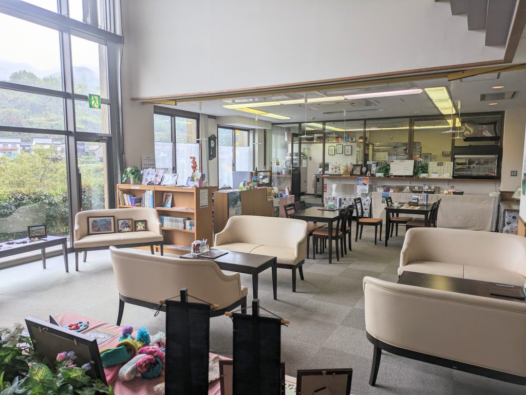 交流センターの中にある施設ですが、大きな開放感のある窓からは自然光と周辺の自然豊かな風景をゆっくり楽しめるカフェ空間となっています。