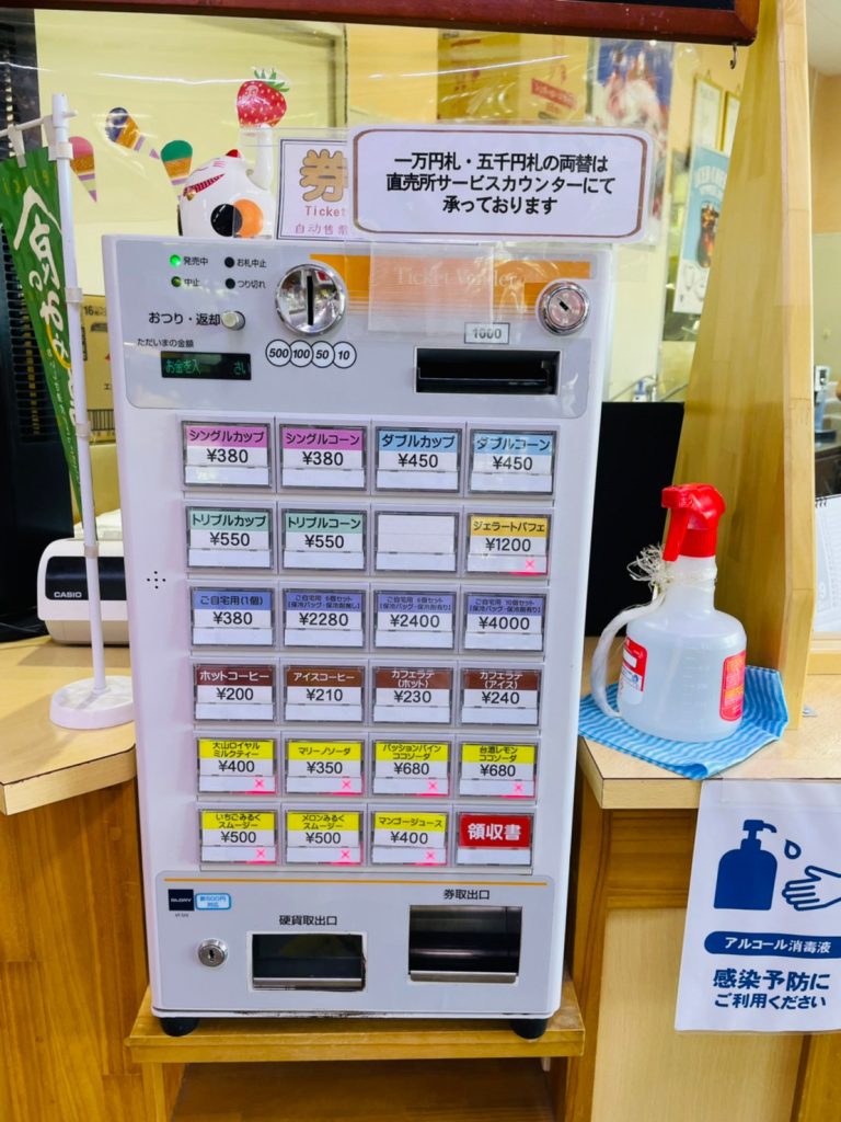 正面入り口を入るとカラフルなジェラートがすぐ目の前に! まずは、券売機でチケットを購入し好きなジェラートを選びます。 〝今が旬〟の野菜や果物のジェラートがたくさんで どれにしようか迷います。