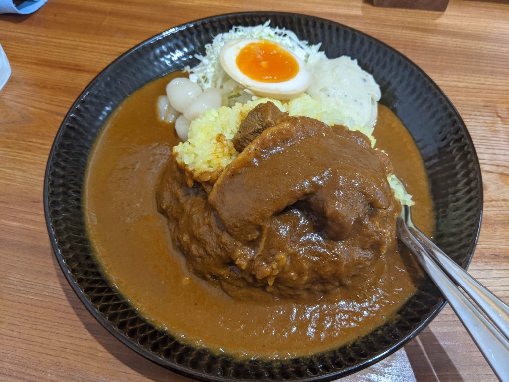 「黒カレー」の上には「大山ルビー」の角煮が添えられていて丁寧な仕込みで柔らかく口溶けが良さが絶品です♪(写真のトッピングは①味付け玉子・③らっきょう・④マッシュポテト)