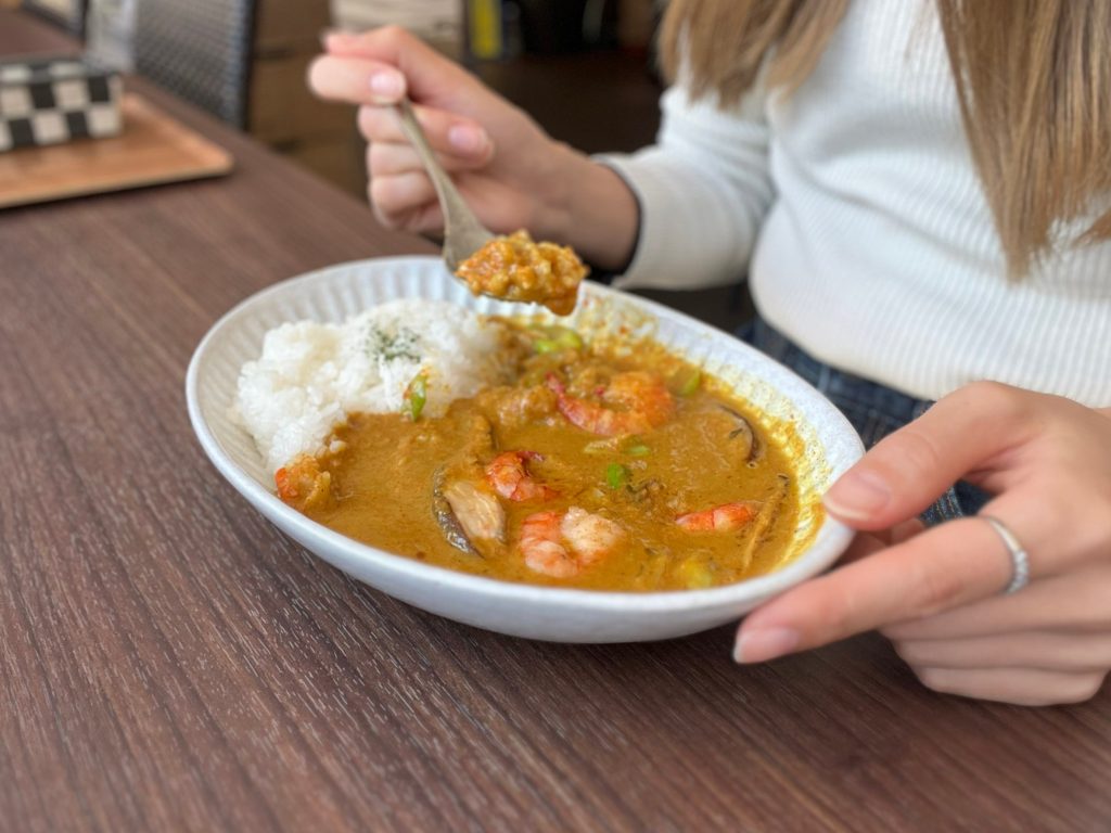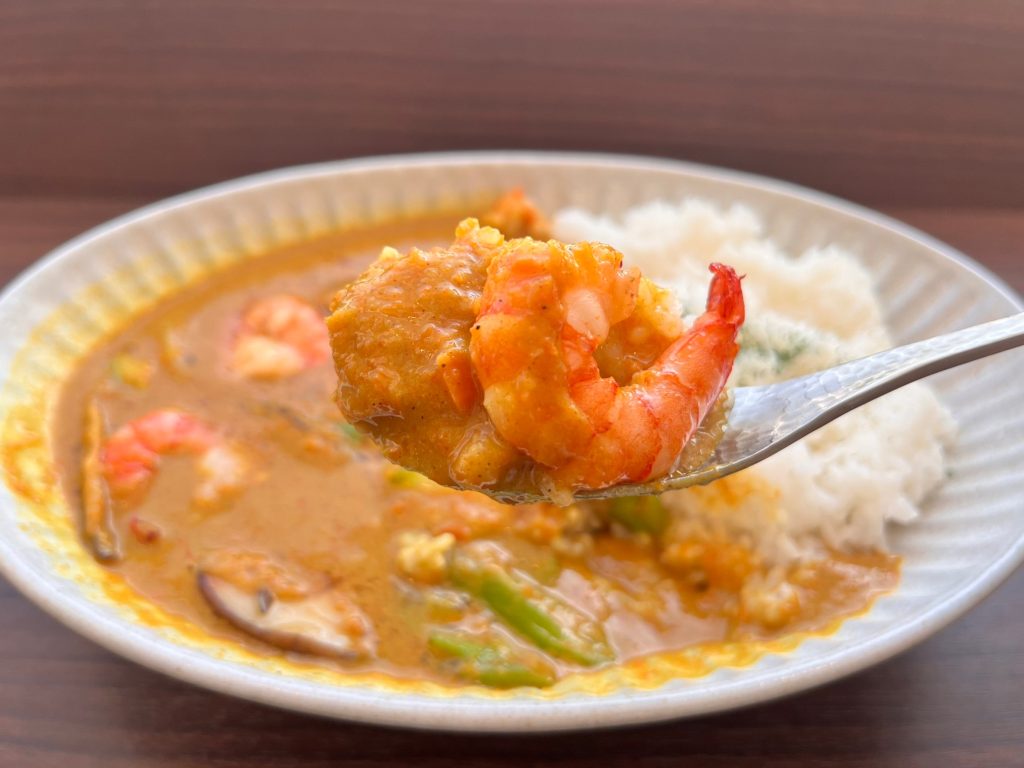 新鮮な野菜の食感が、エビとの絶妙な調和でカレーに深みをプラスしています。また、濃厚でクリーミーなココナッツミルクが、スパイスの辛さを和らげ、まろやかな味わいに仕上がっていました。